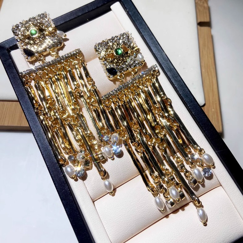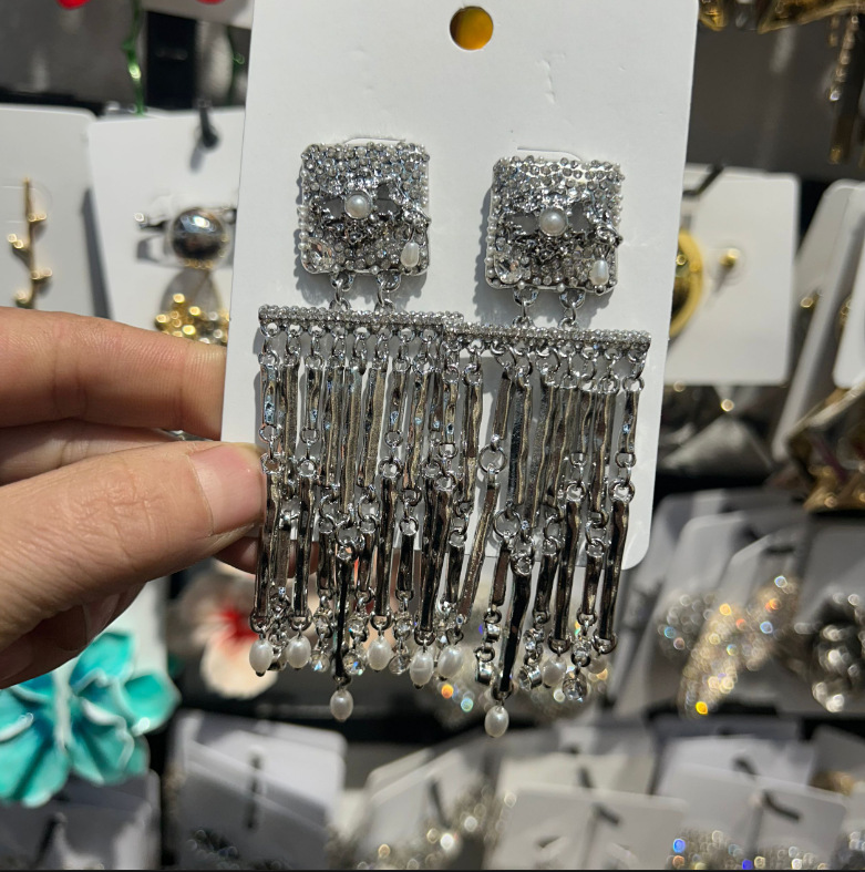 occidental style exaggerating personality diamond Pearl tassel pendant earrings temperament long style square Ea